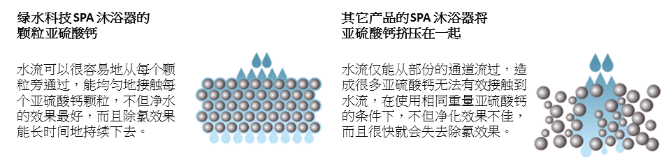 我们舍弃传统商品为了追求小型化而将所有 材料挤压在一起的作法。透过分流技术,将水流分散到四个独立的舱室,使水流能均匀地与每个亚硫酸钙颗粒接触,达到最佳的除氯效果和使用寿命。